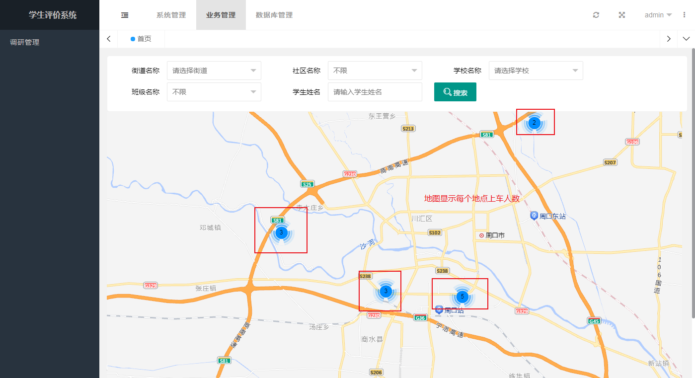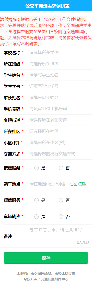 客戶定制的學生公交乘車調研系統(tǒng),實現(xiàn)用戶前臺填寫公交乘車要求,后臺匯總統(tǒng)計,并在地圖上呈現(xiàn)每個乘車人員分布區(qū)域。